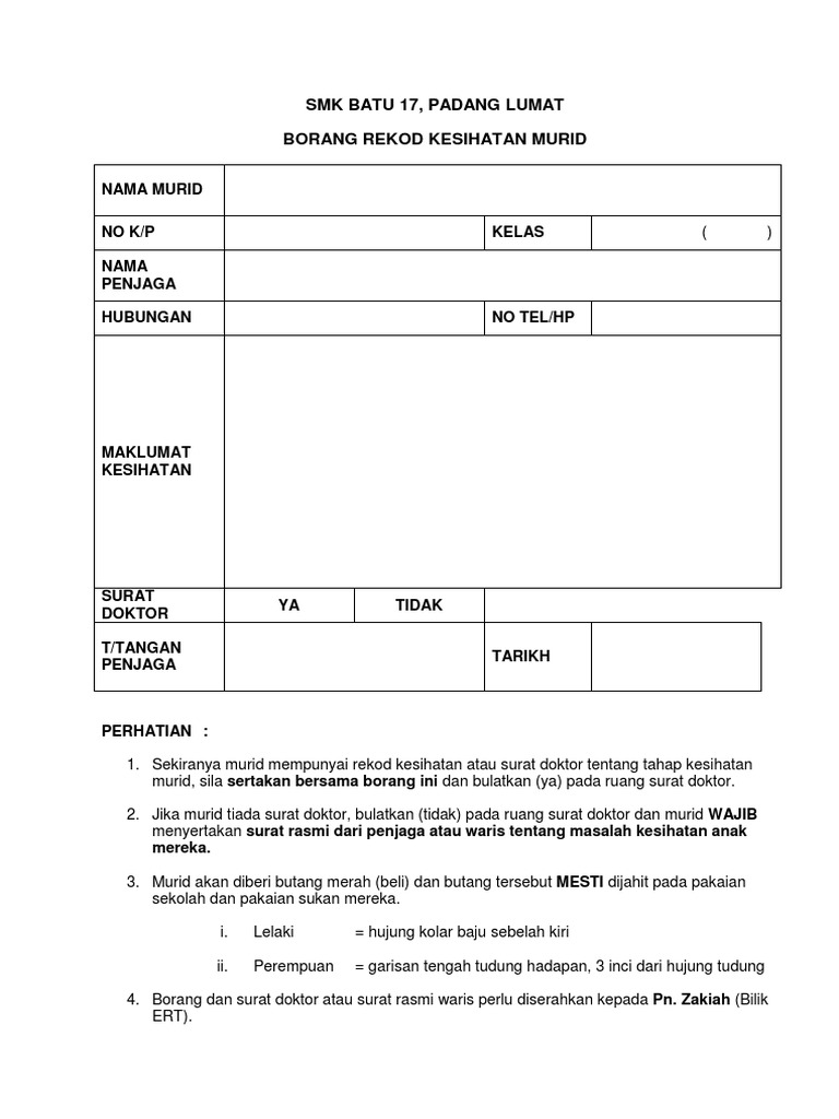 Buku Garis Panduan Perkhidmatan Kesihatan Sekolah ini memperjelas kaedah pemeriksaan dan ti ndakan rawatan keatas murid-murid sekolah oleh anggota dalam Perkhidmatan Kesihatan Sekolah serta proses kerja piawai yang ditetapkan dalam Perkhidmatan Kesihatan Sekolah. Sijil nikahSijil Daftar Kahwin. Buku rekod kesihatan murid rkm1 adalah dokumen yang mencatatkan semua.